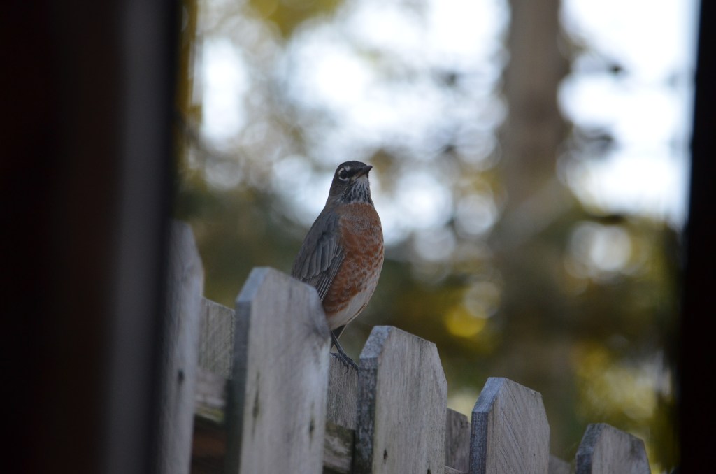 One afternoon, I sat at the dining room table with my camera, photographed the young robin who sat atop our deck’s privacy wall. He seemed to see me through the patio door. He chattered, sang, rivaled the music I had playing on the stereo. I watched the feathers beneath his beak puff out then flatten as he chattered.