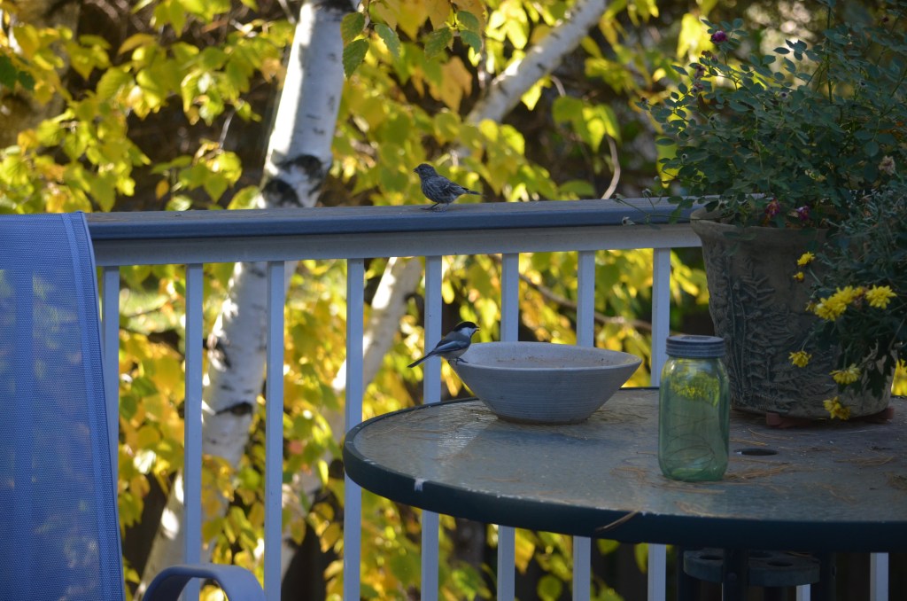 There’s a glazed pottery bowl – wide, shallow – that I filled with water and left on the table in the corner of our deck. I thought birds might use it to get a drink from time to time. The bowl has become a daily water bar and sometimes bath for blue jays, cardinals, robins, finches, sparrows, wrens, juncos, flickers, chickadees, bees, butterflies, chipmunks, and squirrels. Every time I sit at the dining room table for more than five minutes, I see someone pop in for a sip of water. I had no idea that bowl of water would get as much use as it does. I fill it with clean water every day, skim white pine needles and birch leaves from its surface. That I can offer this bit of sustenance to small creatures feels like a purpose, one I can do well while quarantining at home.