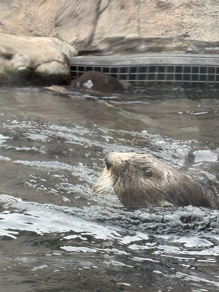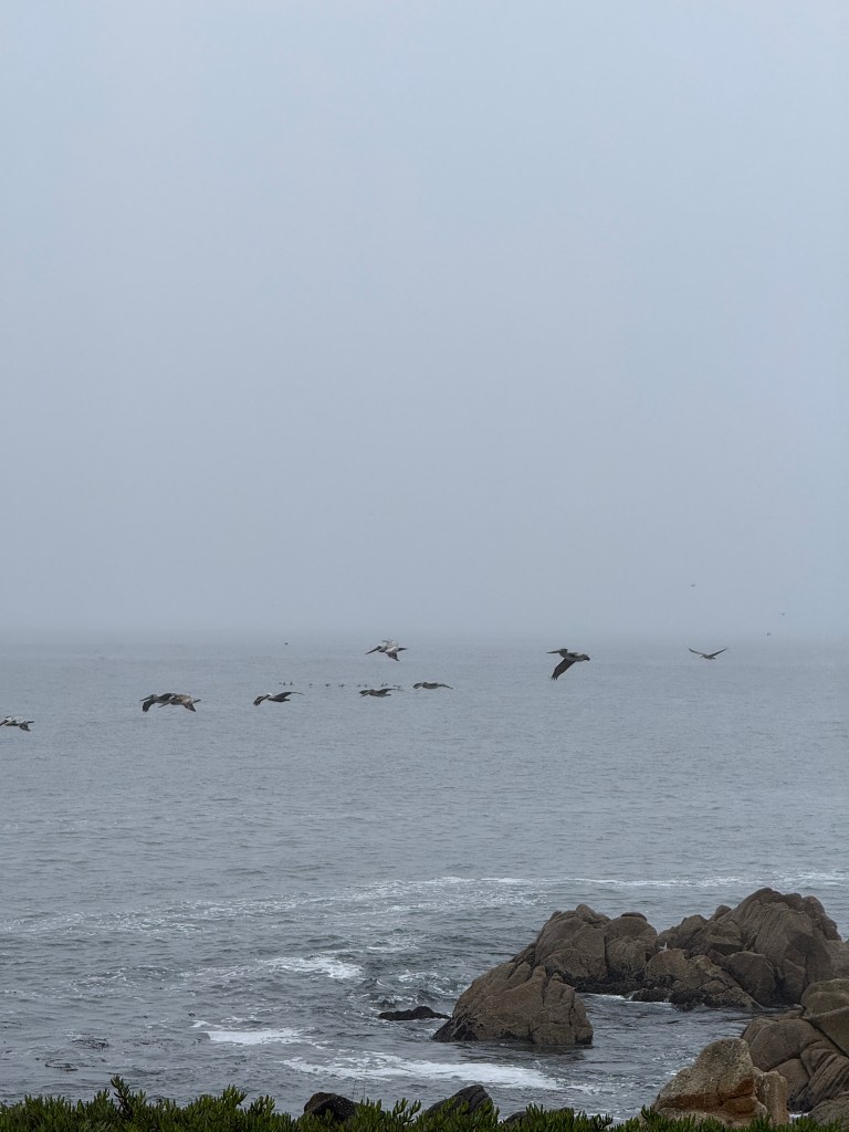 That fog was still there early the next morning. We woke before breakfast was available in the hotel dining room, our bodies still on Minnesota time. We decided to walk down to Lover’s Point to get some exercise.  Big, crashing waves greeted us, and some well-seasoned surfers floated in the roiling water, waiting for a good wave. We watched them for at least half an hour. A relaxed sea otter hung out in the waves just behind the surfers, little paws working on his breakfast. I was surprised at how many people were out so early in the foggy morning, running, walking dogs, watching the ocean. We felt at home. The fog was no less thick when we returned to the Centrella, got coffee, ate yogurt parfaits, and talked about our plans for the day. We decided to walk to the Monterey Bay Aquarium, since it was only a mile away and our rental car was fine parked on the street until later. We arrived just in time to see two humpback whale flukes in the bay. Everyone at the aquarium was excited about the whales, crowded around the observation area, phone cameras rolling. We took it as an auspicious moment, a sign that we were going to see some wonderful things in the week to come.