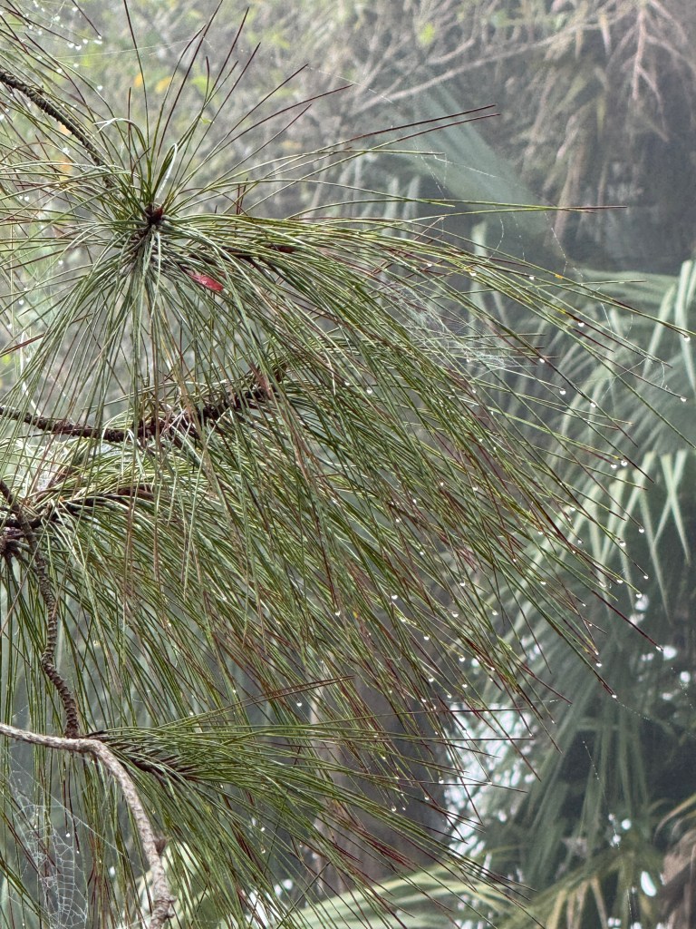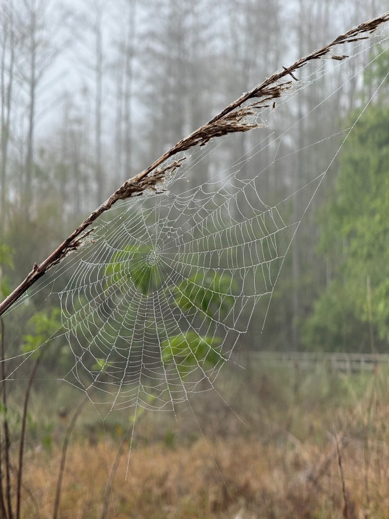 We started our visit in the fog. By late morning, the sun burned most of it away. Water droplets outlined spider webs, pine needles, grass blades.