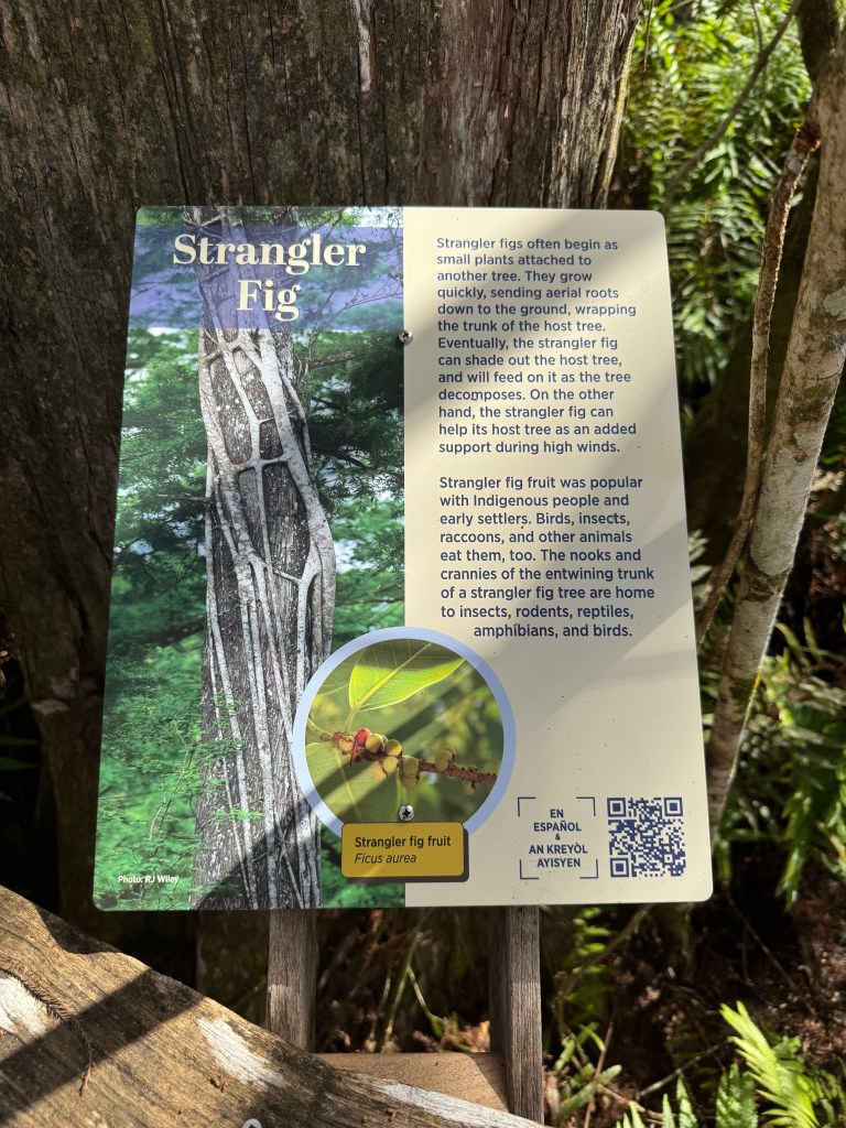 As we moved through the swamp, I thought about how misunderstood swamps are, how people sometimes equate them with something awful – swamps, morasses, cesspools. But this place teems with life, with interdependent systems of support that plants and animals have woven together for centuries. My brother spotted a gorgeous black snake. My sister-in-law spotted the one frog we could see. Mick and I stumbled on a little sign the indicated a barred owl was sitting in a tree straight out in front of a bend in the trail. We marveled at the strangler figs, how they hugged other trees, made intricate designs with their limbs.