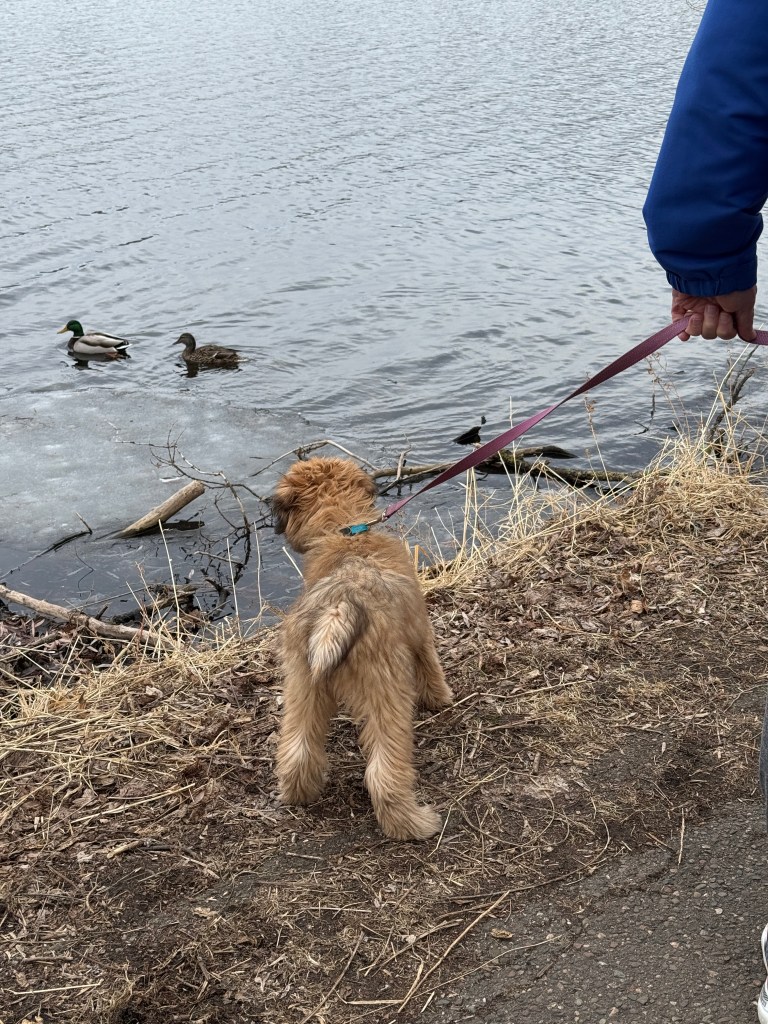 This past weekend was a gray, wet example of March in Minnesota. On Saturday, I walked Finn in sharp morning air. Some other dogs were barking up a storm, but Finn, to his credit, was too busy sniffing and listening and looking around to answer back. At not quite four months old, he is learning leash etiquette. Itโ€™s slow going. He jumps on me at least once during each walk, as if to check that itโ€™s still not a thing he should do. Iโ€™ve been making sure to wear old pants when I walk with him since he put a hole in one pair I love with those sharp puppy teeth; he nips at my pants every time he jumps on me. Heโ€™s not as persistent as he was the first time he tried this kind of behavior โ€“ that was the day he put the hole in my pants and he would not stop jumping on me, grabbing my pants in his mouth, making a giant game of it. I spent several minutes putting my knee out to make him get off my leg, only to have him jump again. I finally turned my back to him and waited him out. What is it about jumping that puppies love so much? Weโ€™ll have to talk to our trainer when Finn starts puppy classes in another week and a half. Weโ€™re determined to train this dog a little better than our first three. Weโ€™ve never been very strict.