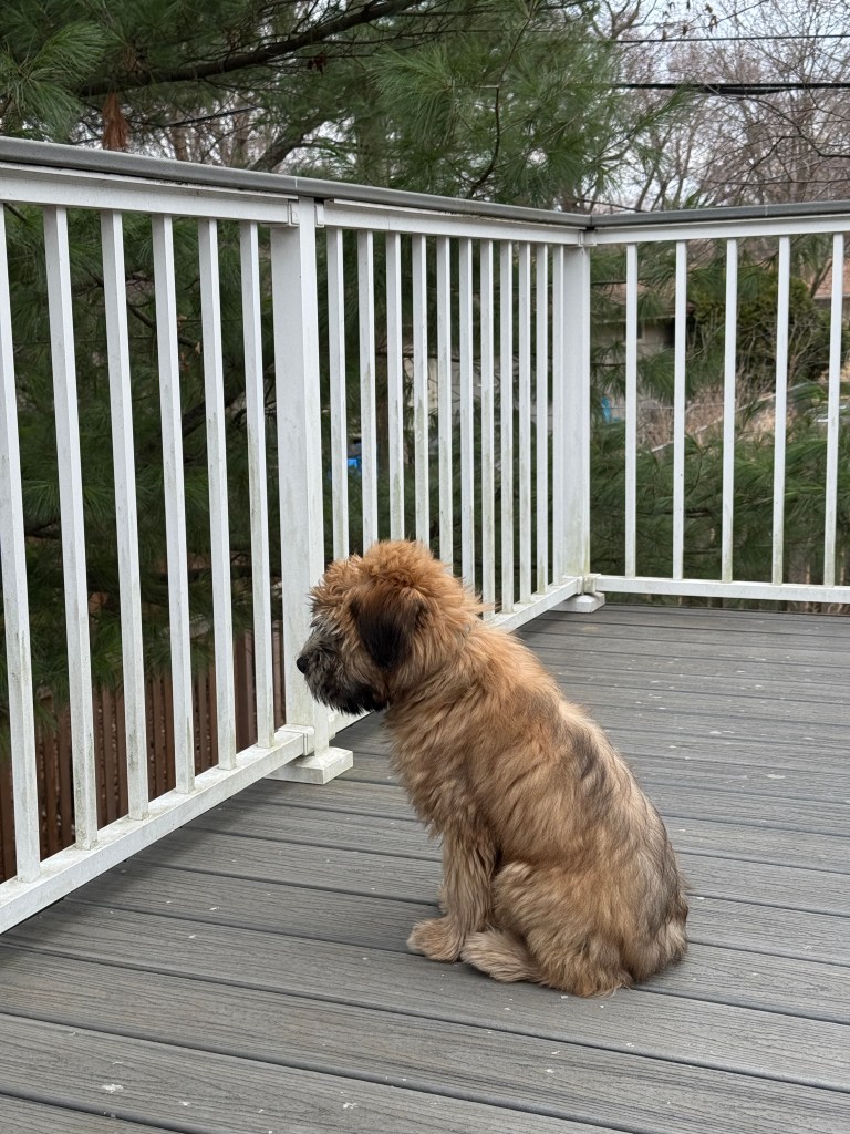 Heโ€™s already quite a snuggler. He loves to hang out with us on the couch when we watch shows in the evening. He hangs out at our feet during dinner โ€“ mostly. In fact, heโ€™s hanging out near my feet as I write this post, laptop set up on the dining room table. And Iโ€™ve discovered he really likes being out on the deck when weโ€™re out there. It hasnโ€™t been warm enough often enough yet this year to do that much, but he spent a good amount of time out there with me on Friday, while I had a cup of tea and read a book. He didnโ€™t bark once. That is my favorite thing about him right now โ€“ he doesnโ€™t bark his head off even when he sees another dog. Our last dog, Truffles the mini doxie, barked until she worked herself into a frenzy; she was the most reactive dog of the three we had before Finn. This is a nice switch.