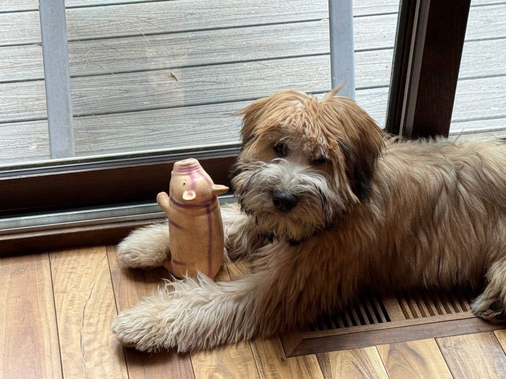 As I write this, our wheaten terrier Finn chases around the table where I sit, playing with a latex pig dog toy that grunts when he mouths it. It really sounds like a little pig. He loves to chew on the ears, which makes the pig grunt some more. He plops in front of the patio door where light streams in, chews his pig, stretches out, and is happy.