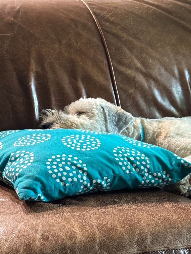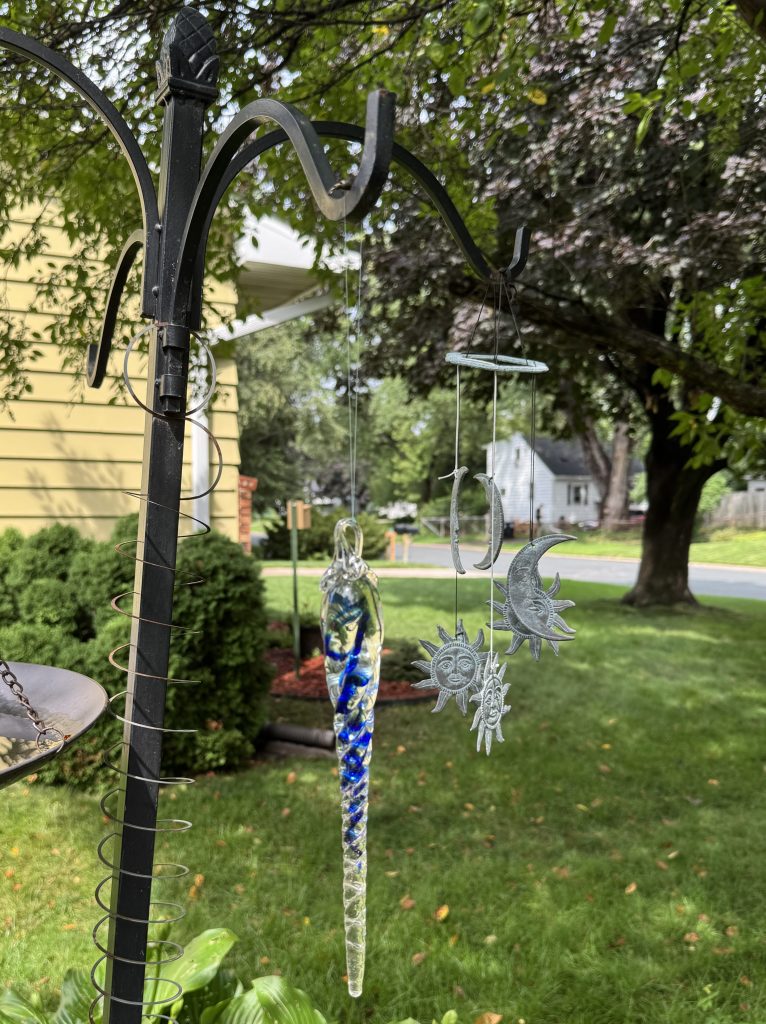 For the first time in ages, I took a 20-minute nap. Three nights in a row of being awakened by a dog with tummy troubles. Muggy afternoon, soft summer clouds – perfect for resting. Soft summer wind. Birds chirping and twerping here and there. Sweep away the cobwebs on the front porch. Apologize to the dislodged spiders. Find the glass icicle my now-passed friend Zola gave me on a shelf in the garage. Hang it on the quadruple shepherd’s hook under the crabapple. Blue swirled through the clear glass. It cannot melt. Oh how it catches the afternoon light.