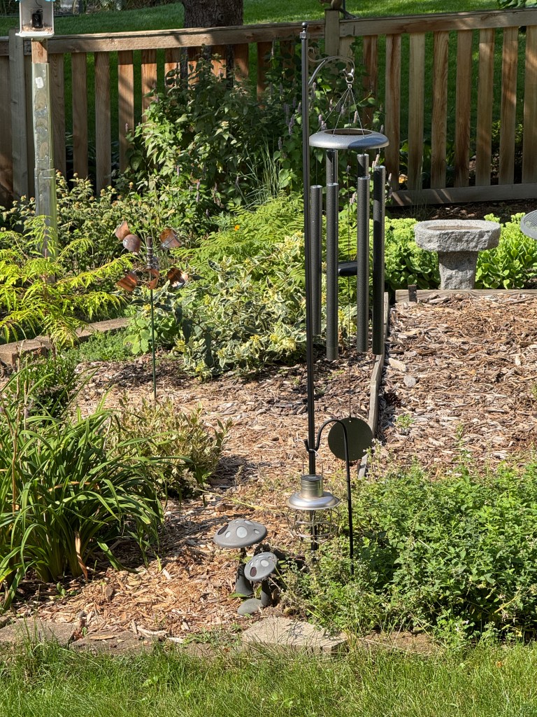 Smell of those petunias strong as I work at the table on the deck. Our copper whirligig garden art twirls in the wind, flings fragments of light across the garden. Wind chimes sing in soothing temple-like tones. I get up to stretch, walk the garden, pull lambsquarters and nightshade from the dirt, toss them into the compost. Bumblebees continue to be everywhere among the flowers, buzz in all parts of our yard.