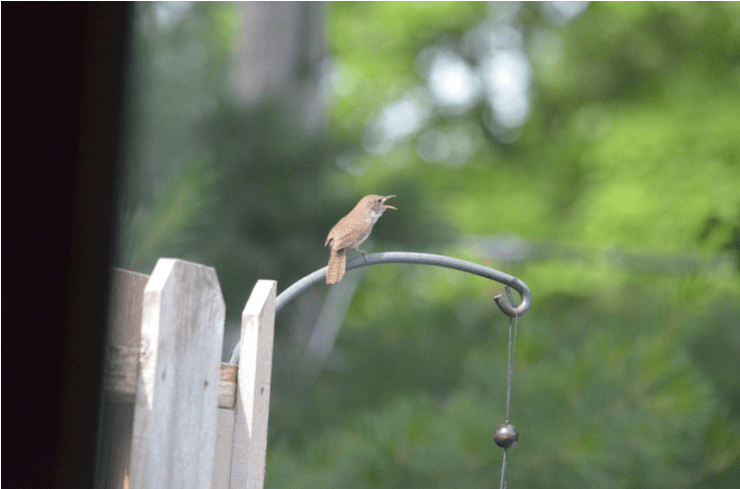 Tuesday morning, we watched the birdhouse entrance. Sure enough, the wrens were there. One came out and flew away. A few minutes later, another wren poked its head through the hole and looked around before heading out for whatever bird errand needed to be done. We’ve heard them singing in that impossibly loud way wrens sing. Such volume from such tiny bodies. The wrens are sassy creatures who flit from spot to spot, wren arias exploding through the air while they elude us as we try to find them. They make us laugh when they suddenly appear right in front of our patio door or on top of the birdhouse they’ve decided to stay in.